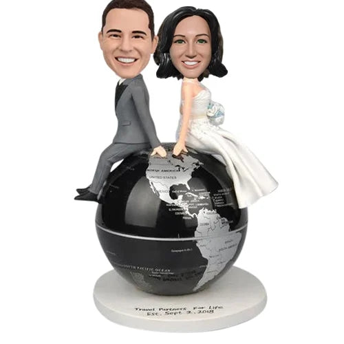 Custom groom and bride bobbleheads on globe